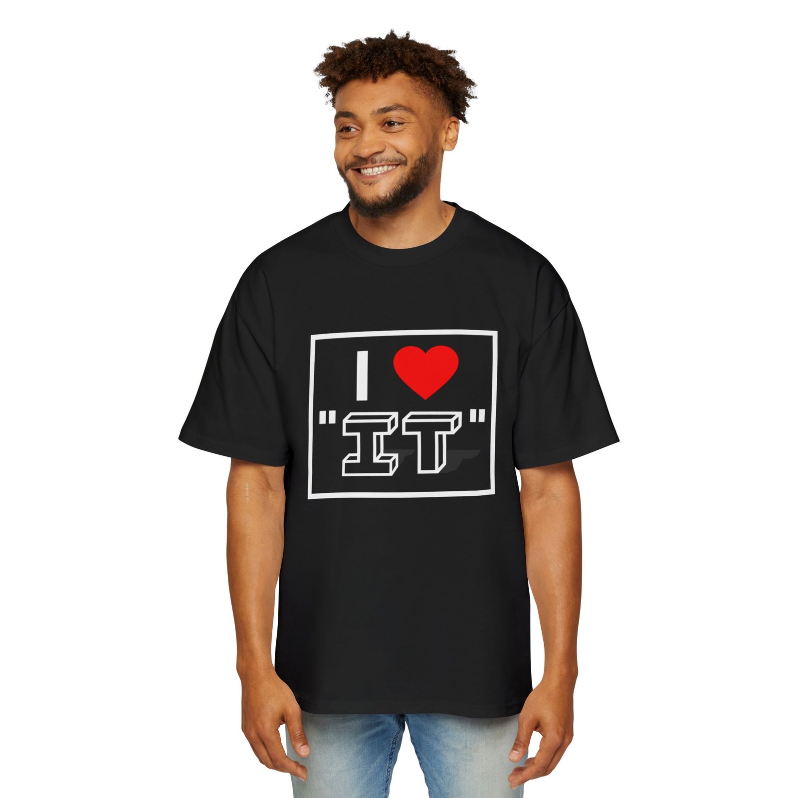 Soft, lived-in confidence in a single tee. This oversized shirt wraps you in a roomy, dropped-shoulder silhouette that reads casual and deliberate — the kind of piece you reach for when you want comfort that still makes a statement. The graphic is bold and playful: a framed, stencil-style message with a bright heart that pops against the dark fabric. Medium-heavy carded cotton gives it a substantial hand that softens with wear, and reinforced shoulder-to-shoulder tape plus double-needle hems mean this shirt keeps its shape through wash after wash. Wear it for late-night hangouts, road trips, or slow weekends when you want to be comfortable and a little cheeky.